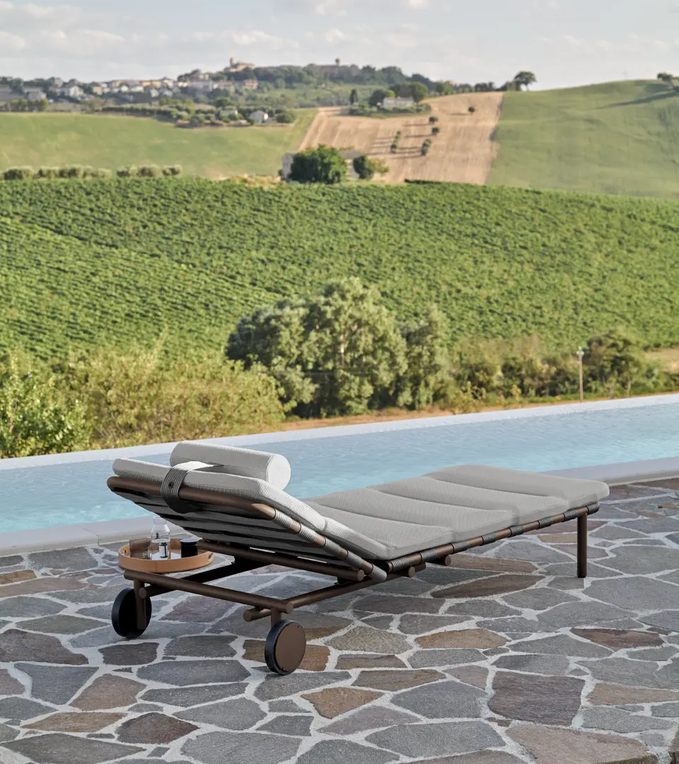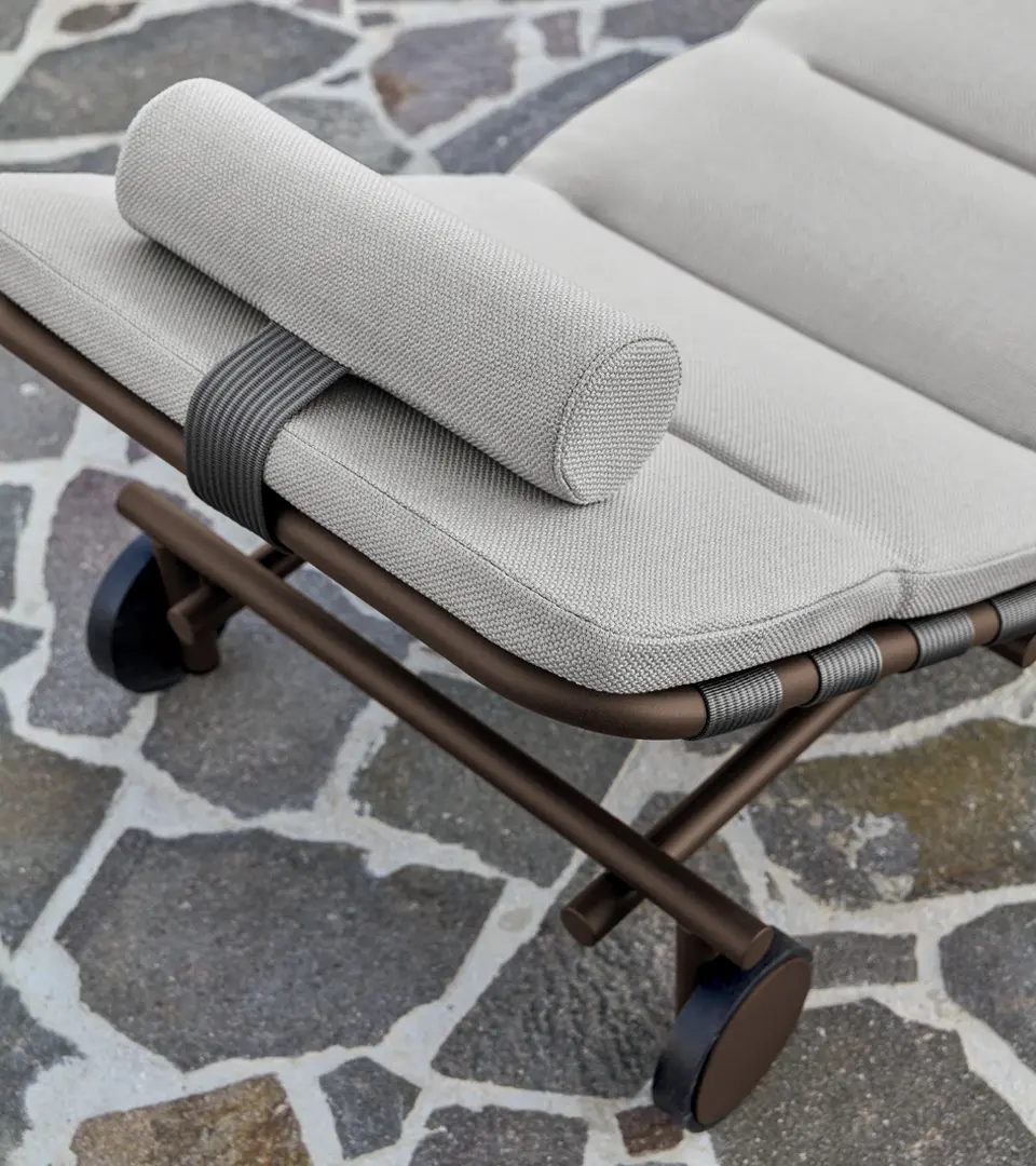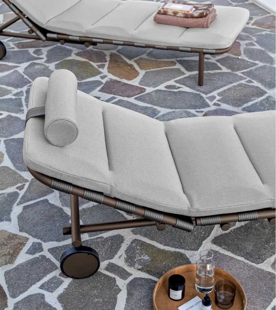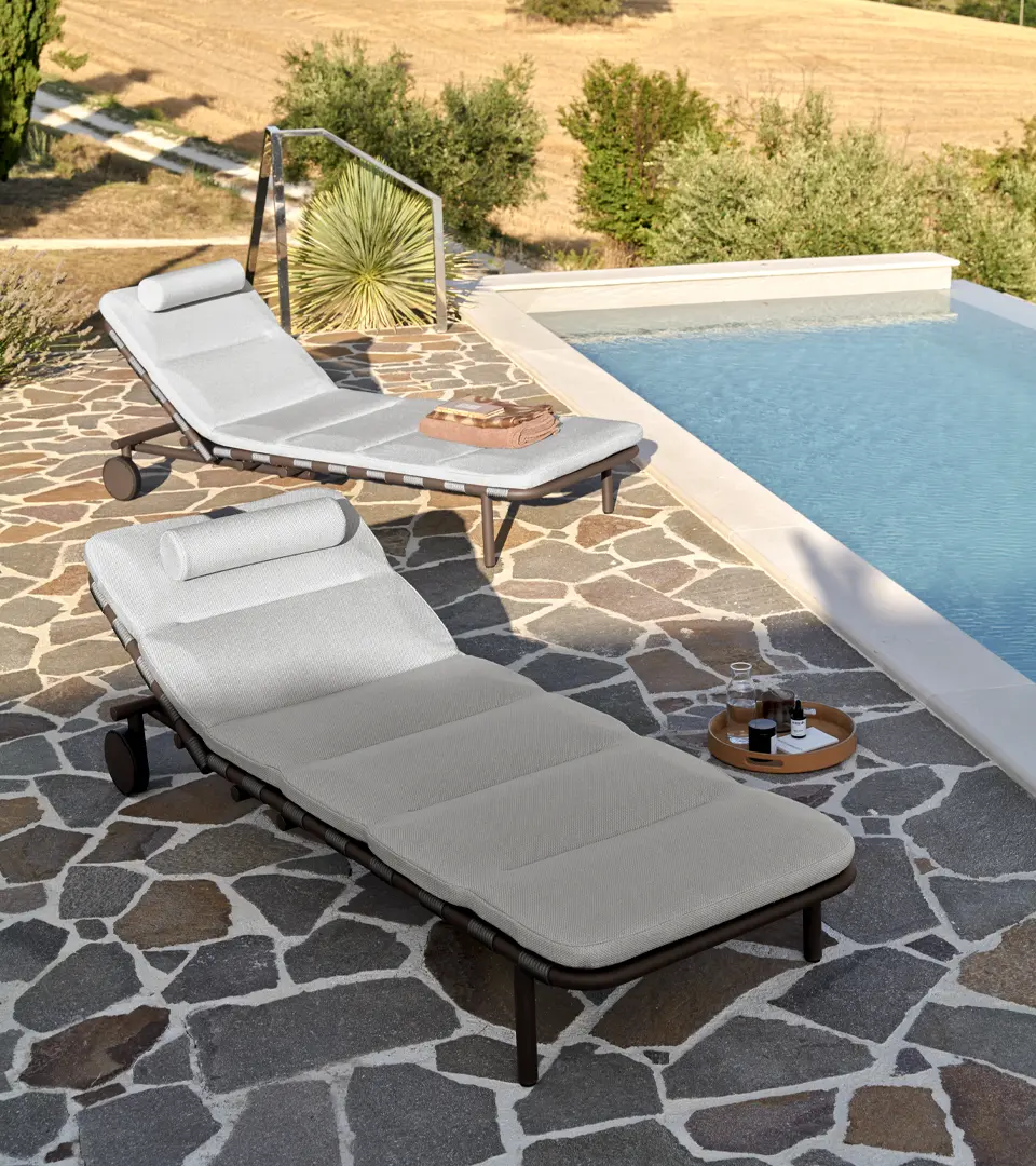 Argentario ist eine Einladung, sich den Freuden der Ruhe, des Lesens, des Vogelgezwitschers sowie der Kühle der Bäume oder dem Atem des Windes hinzugeben. Diese Sonnenliege nimmt die ästhetische Sprache der Outdoor-Familie wieder auf, mit klaren röhrenförmigen Linien und sichtbaren Riemen, begleitet von der integrierten Ablage für vollständige Entspannung. Die subtile Leichtigkeit der Matte, die sich durch geometrische Wiederholungen auszeichnet, macht Argentario harmonisch und grafisch zart und verleiht ihm eine raffinierte Eleganz, die für eine hervorragende Einrichtung charakteristisch ist.