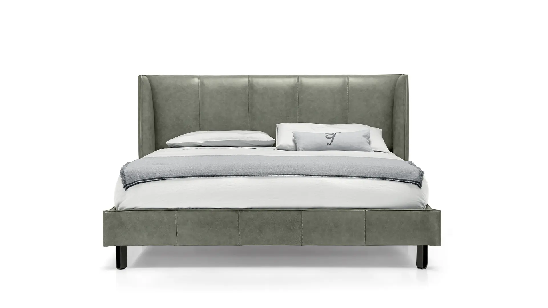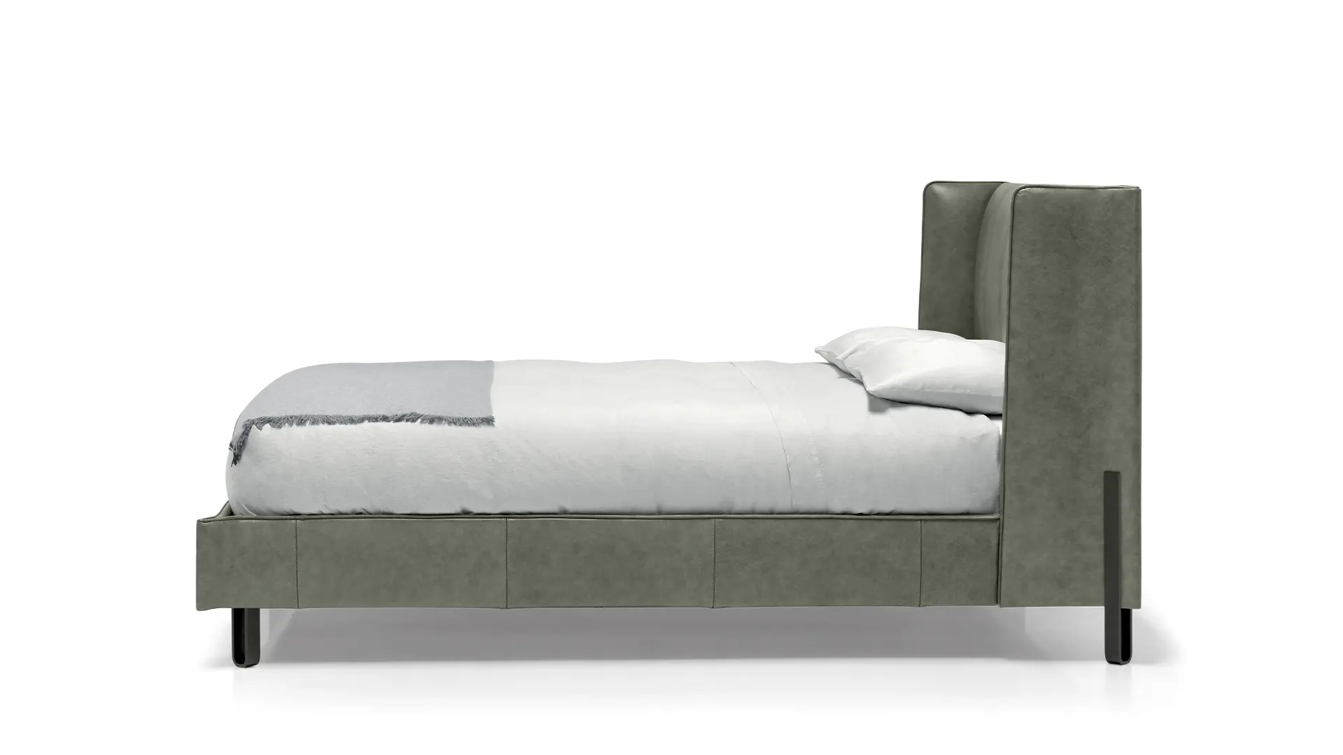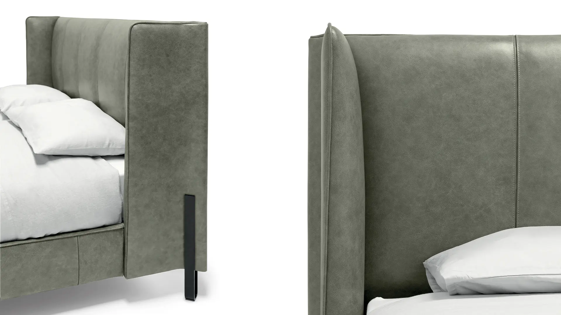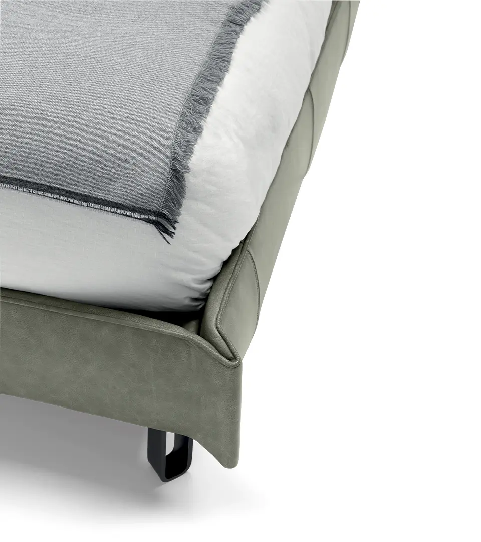 The clip pinches the edges of the continuous surface of the covered panel, generating an overhang in the fold and enhancing the well-tailored qualities of the fabric. This exactingly crafted embellishment is duplicated in the corners of the bed frame, becoming fibula and foot alike. The headboard is a meticulous rectangular-shaped panel, folded on the sides, at once a protective niche and a refined aesthetic element. The vast, generous lenticular surfaces are taut yet accommodating, enhancing the experience of intimate comfort that makes the night an endless adventure.
