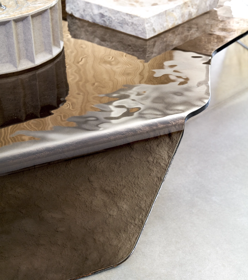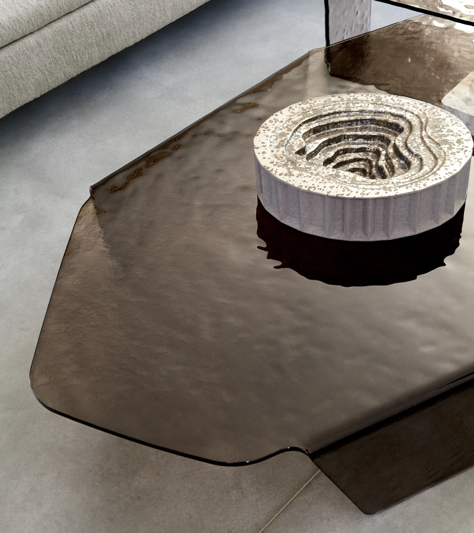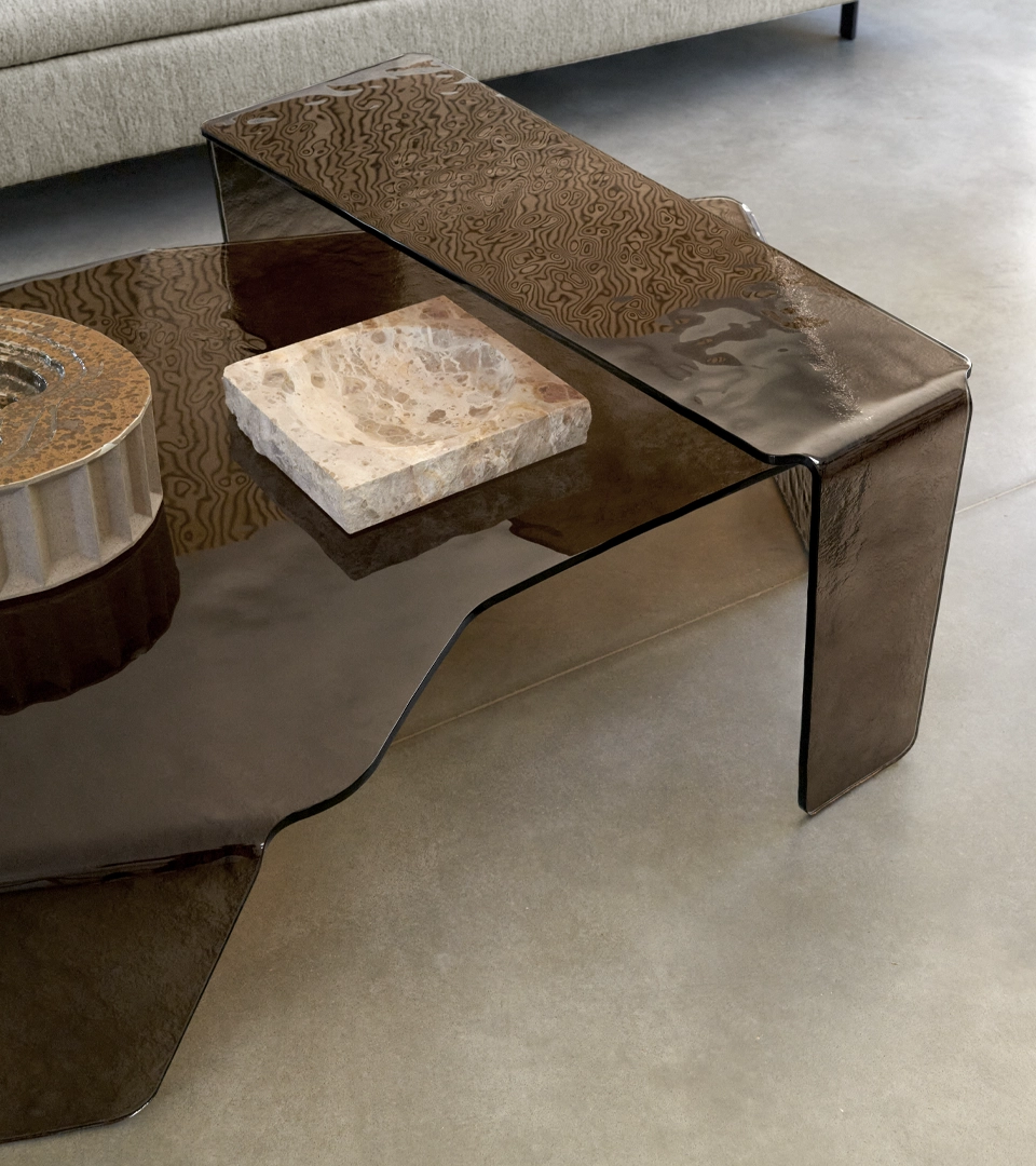 Made of curved and hammered smoked glass, the table amazes with the sinuous shape of the top that curves in three strategic points so as to cradle the structure that supports it. The special processing of glass means that the light can play and create the illusion of waves rippled by the wind.