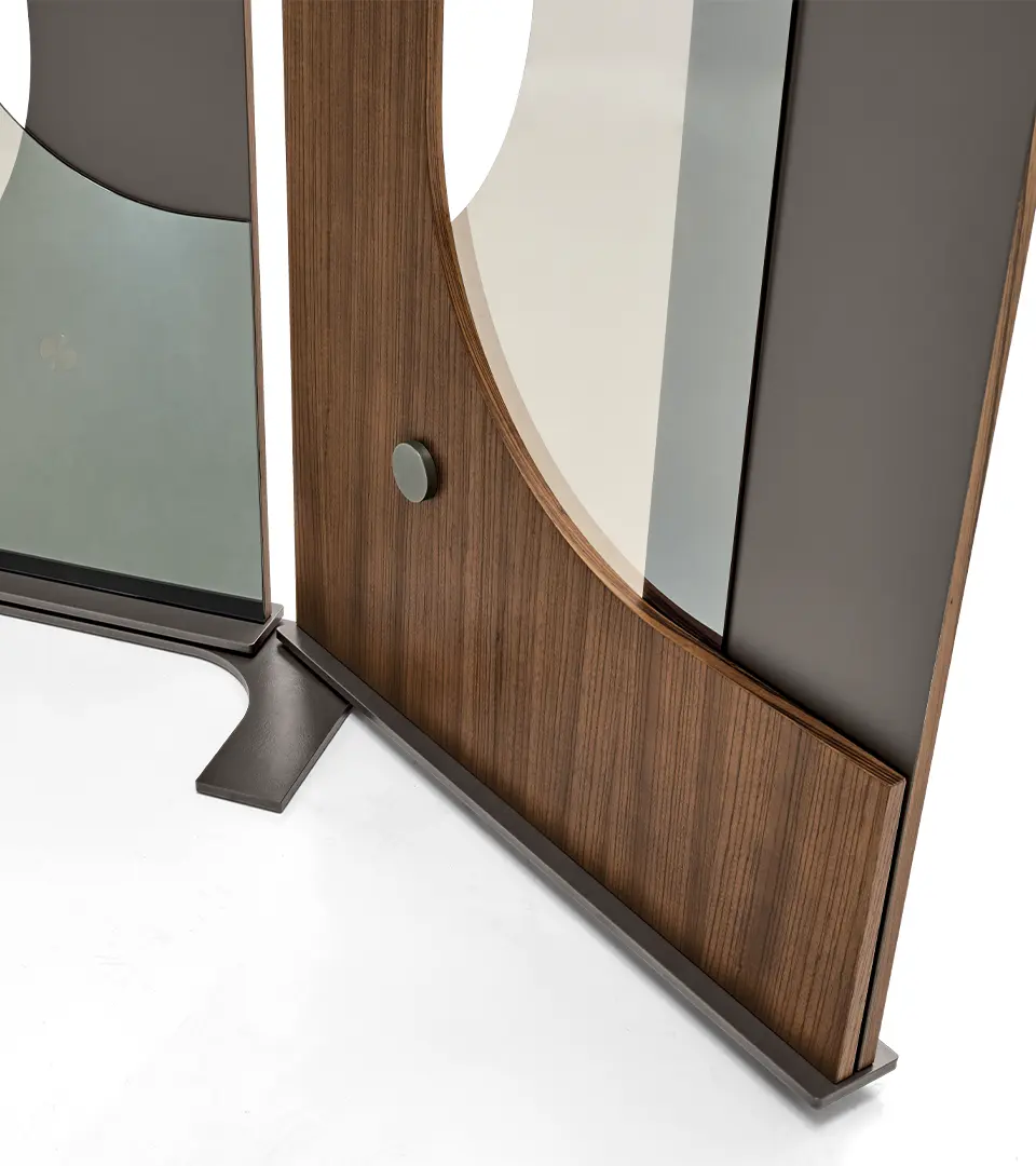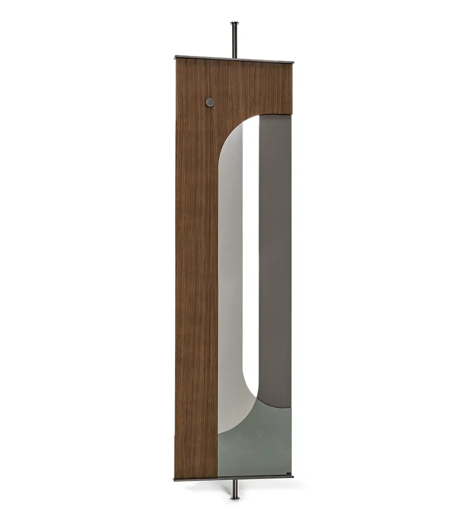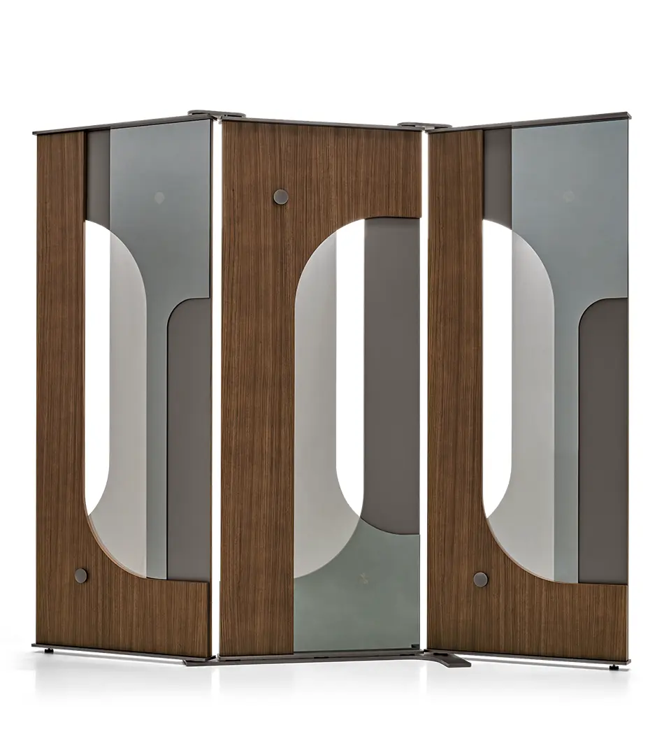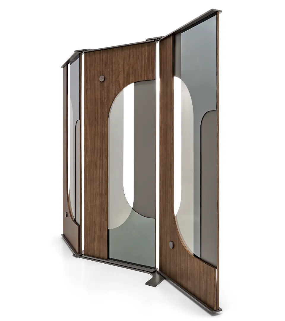 And this is what Gino Carollo has managed to do. In Hide Me, he has created two different types of separation, one from the ground, the other from the ceiling. Each panel is a combination of more materials: zebrano or eucalyptus wood, mirror, varnished wood and metal inserts. By making this obvious contrast, this obvious separation so detailed and yet so measured it reflects our own internal needs and interior acknowledgements.