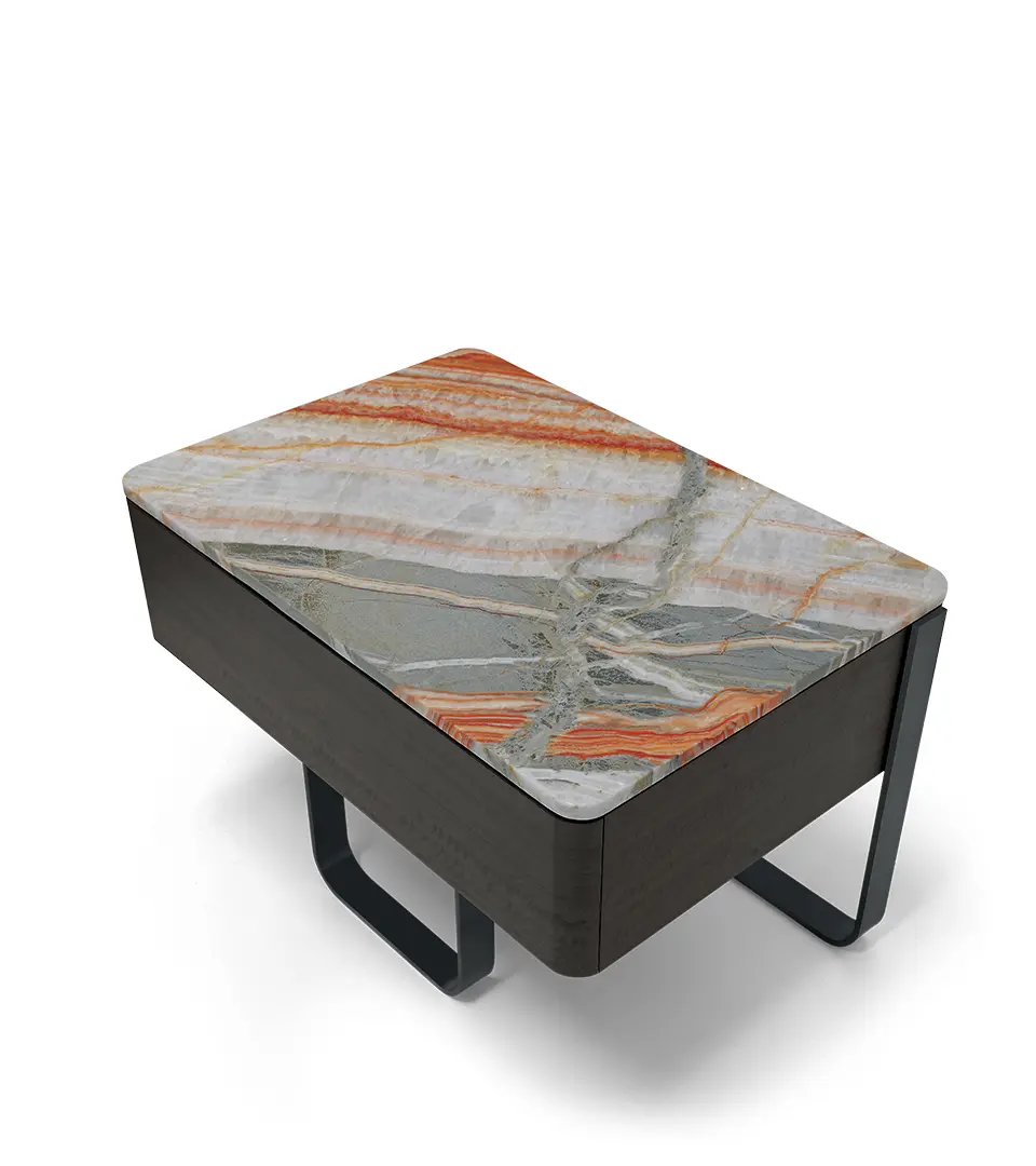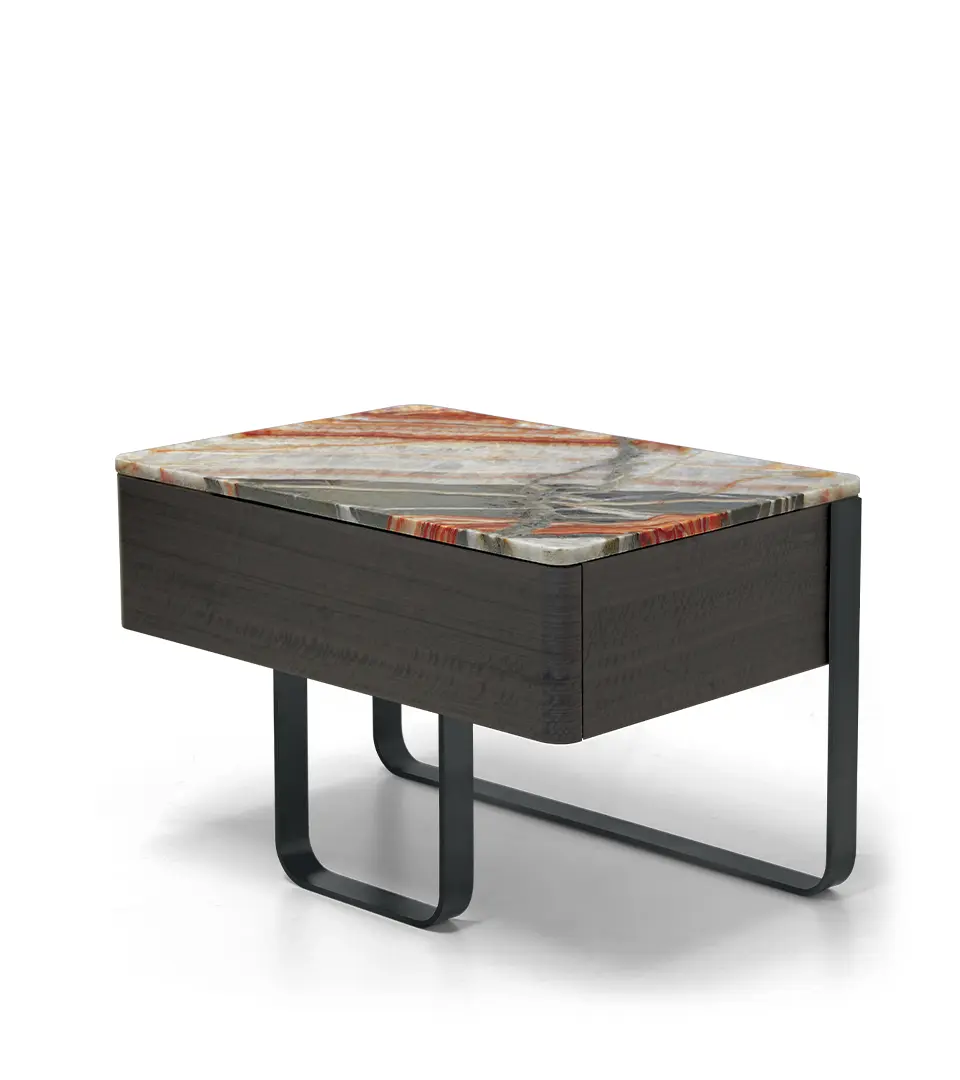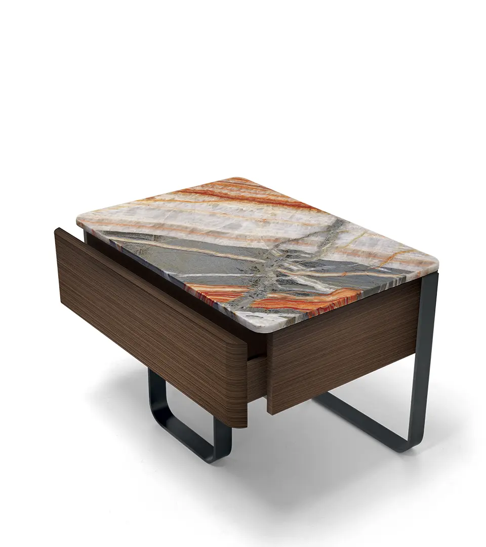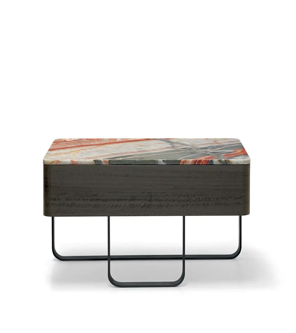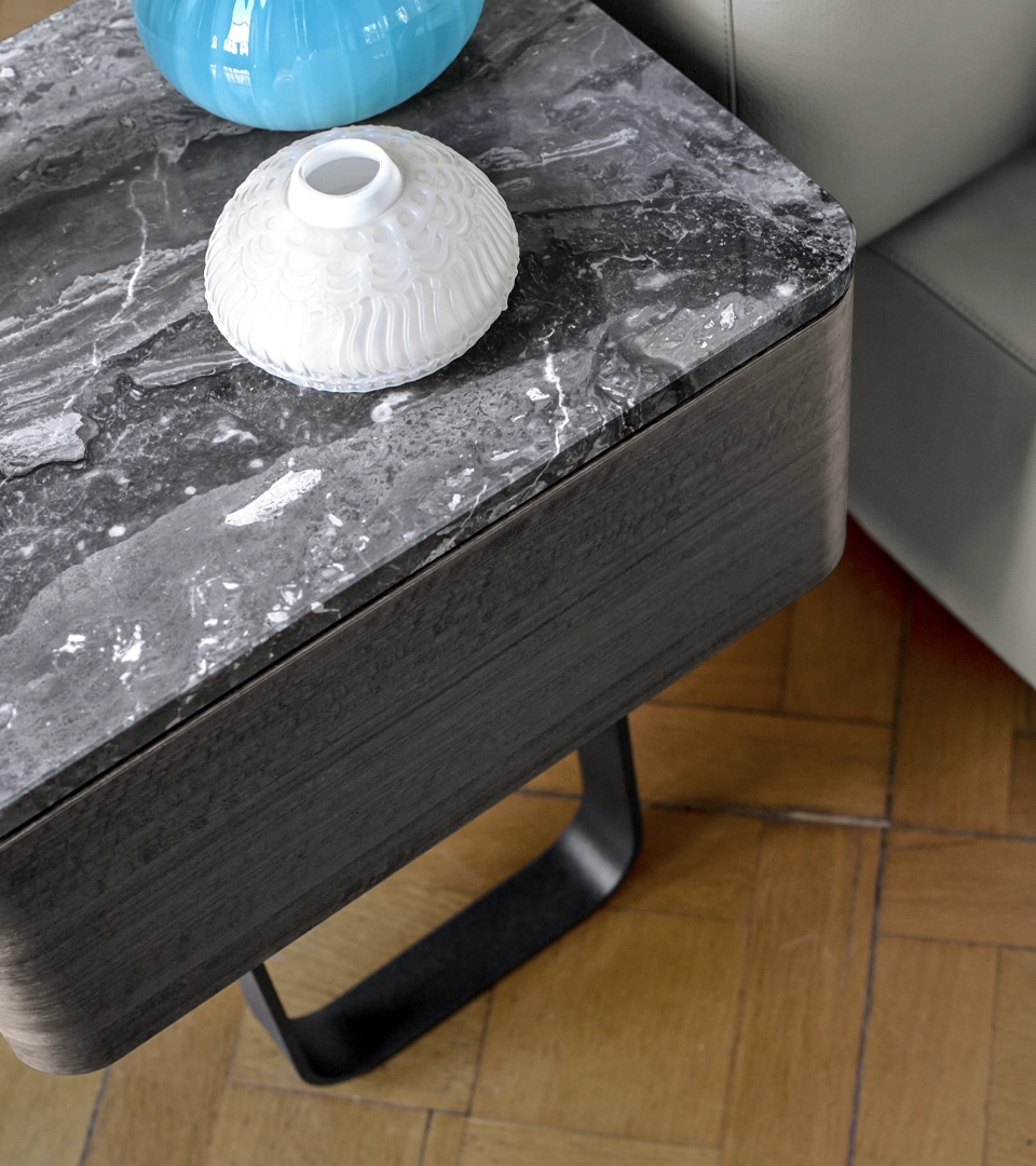 Su capacidad de moldear el espacio cambiante pasa por un diálogo entre corporeidad volumétrica y ligereza estructural. Con su forma sobria y refinada, se presentan con naturalidad como objetos valiosos, únicos y elegantes, auténticos cofres que se convierten en protagonistas discretos del área que rodea la cama. Las patas, de perfiles de metal curvado, como pasadores, aportan ligereza al cajón que parece flotar con un sentido de solidez, logrando un perfecto equilibrio estético, mientras que la falta de aristas produce una sensación de funcionalidad ergonómica.