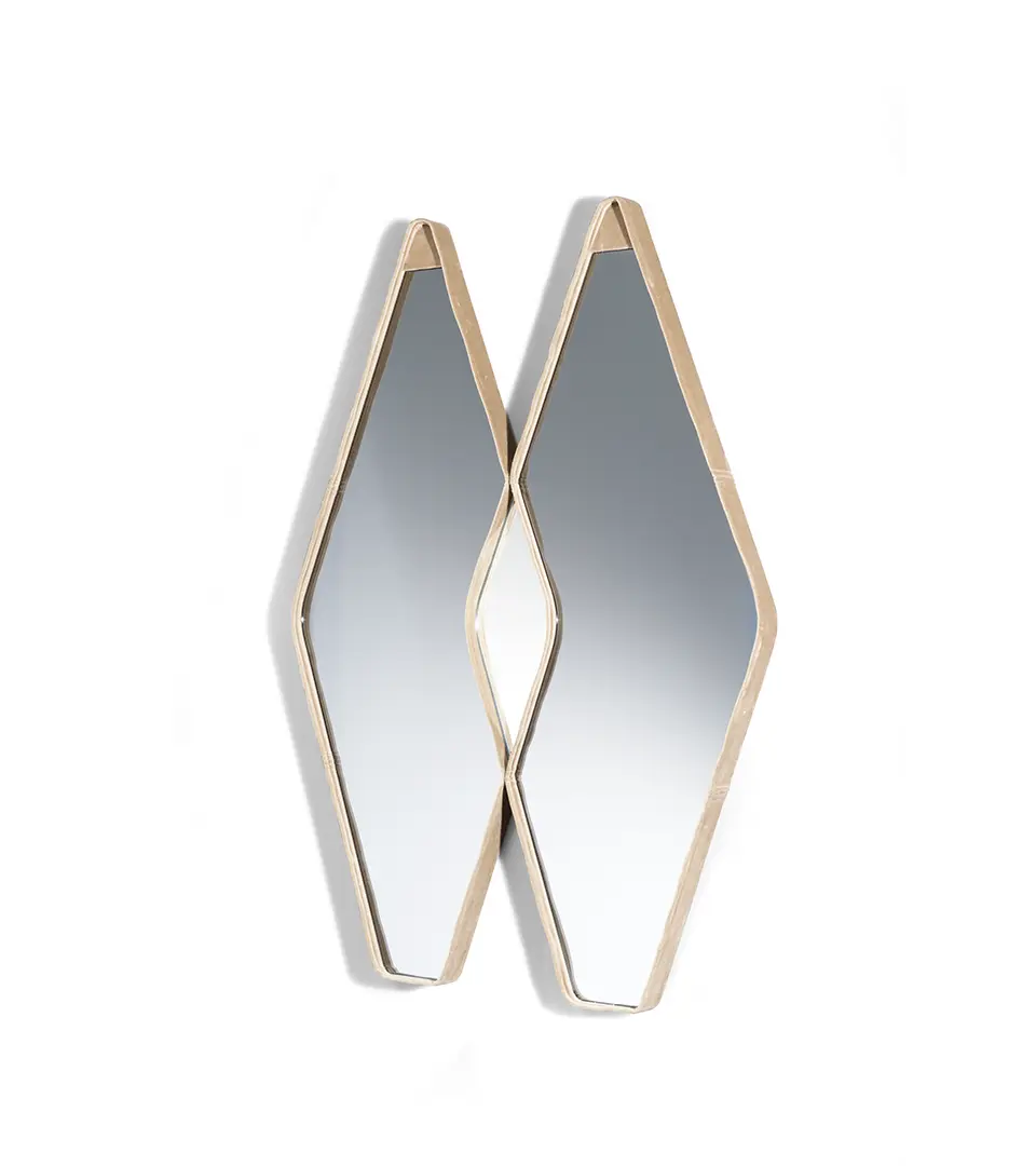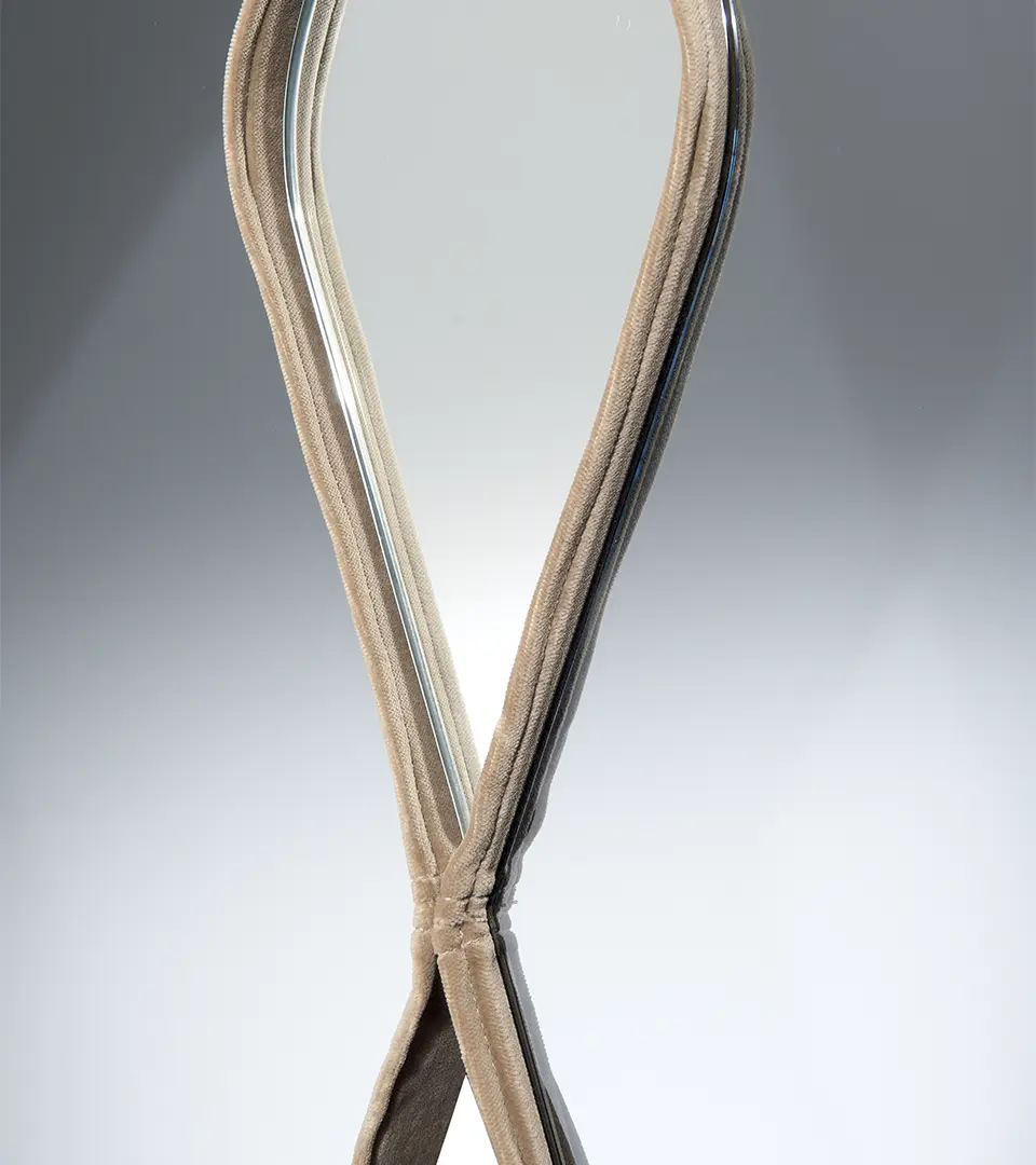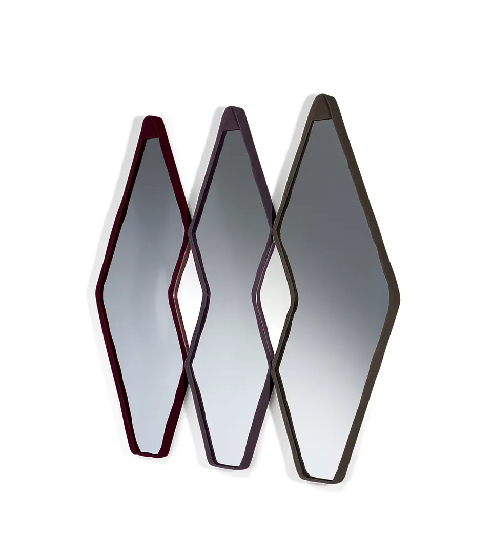 El espejo Venity Fair, proyectado por Gino Carollo, en cristal espejado o espejado ahumado, revestido en terciopelo o piel, para obtener un efecto de lujo y preciosidad discreta en contraste con la linealidad de la forma romboidal, puede ser simple o doble o triple o incluso completar una pared añadiendo y repitiendo el modulo a lo largo de toda la superficie.