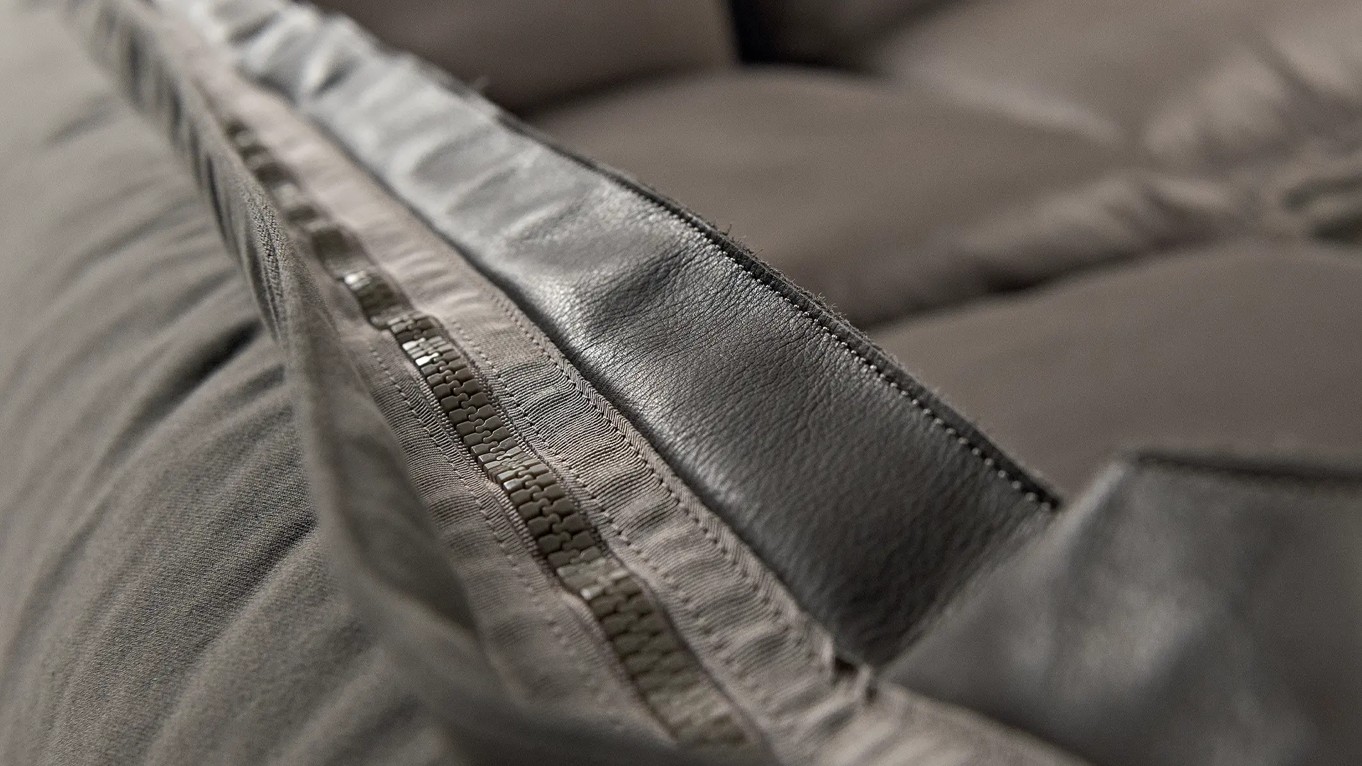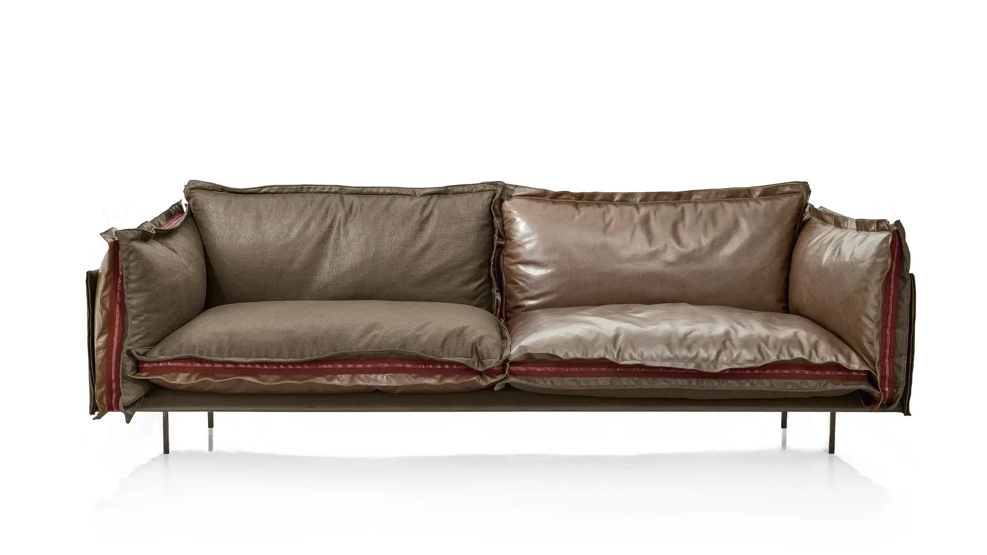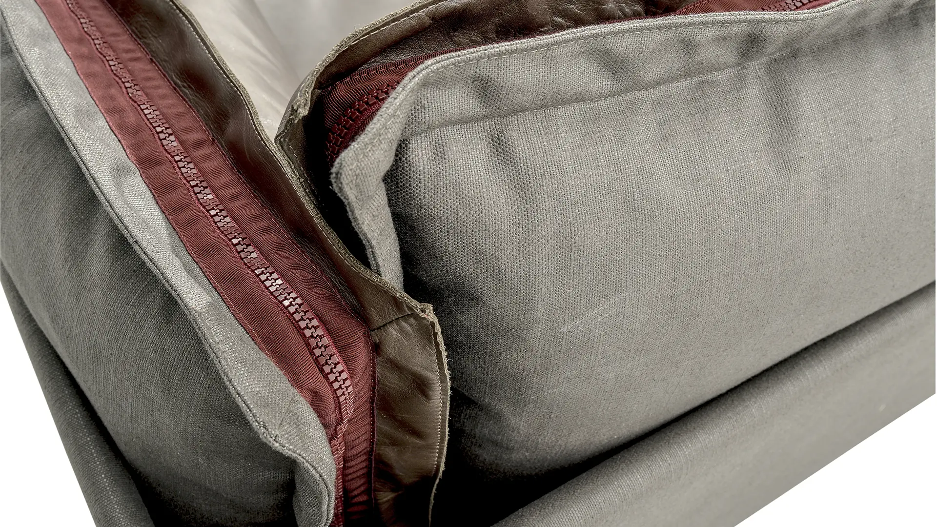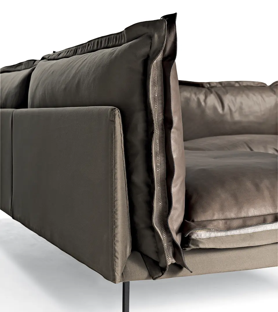 Son apparent désordre visuel s’oppose à l’ordre et au soin des détailles, pour obtenir an objet au style décidé, défini et haute de gamme. La structure subtile, élégante et discrète entoure et contient les coussins d’assise, de dossier et des accoudoirs, soulignés par des volants tout le long du périmètre qui donnent mouvement à là ligne du canapé et une extrême souplesse visuelle et tactile. La fermeture éclair importante, appliquée aux quatre cotés des coussins, unit les deux revêtements des coussins, donne rigueur et souligne le design particulier. Il est possible créer plus d’un million de combinaisons en mélangeant les couleurs des fermetures éclairs, des tissus et cuirs disponibles dans la riche collection Arketipo, pour obtenir des combinaisons chromatiques différentes et des assortiments sophistiqués. A l’intérieur du même produit et dans le même espace peuvent coexister la délicatesse, la chaleur du tissu et l’élégance du cuir. La structure se relève grâce aux jambes minimales réalisées en métal à section carrée.