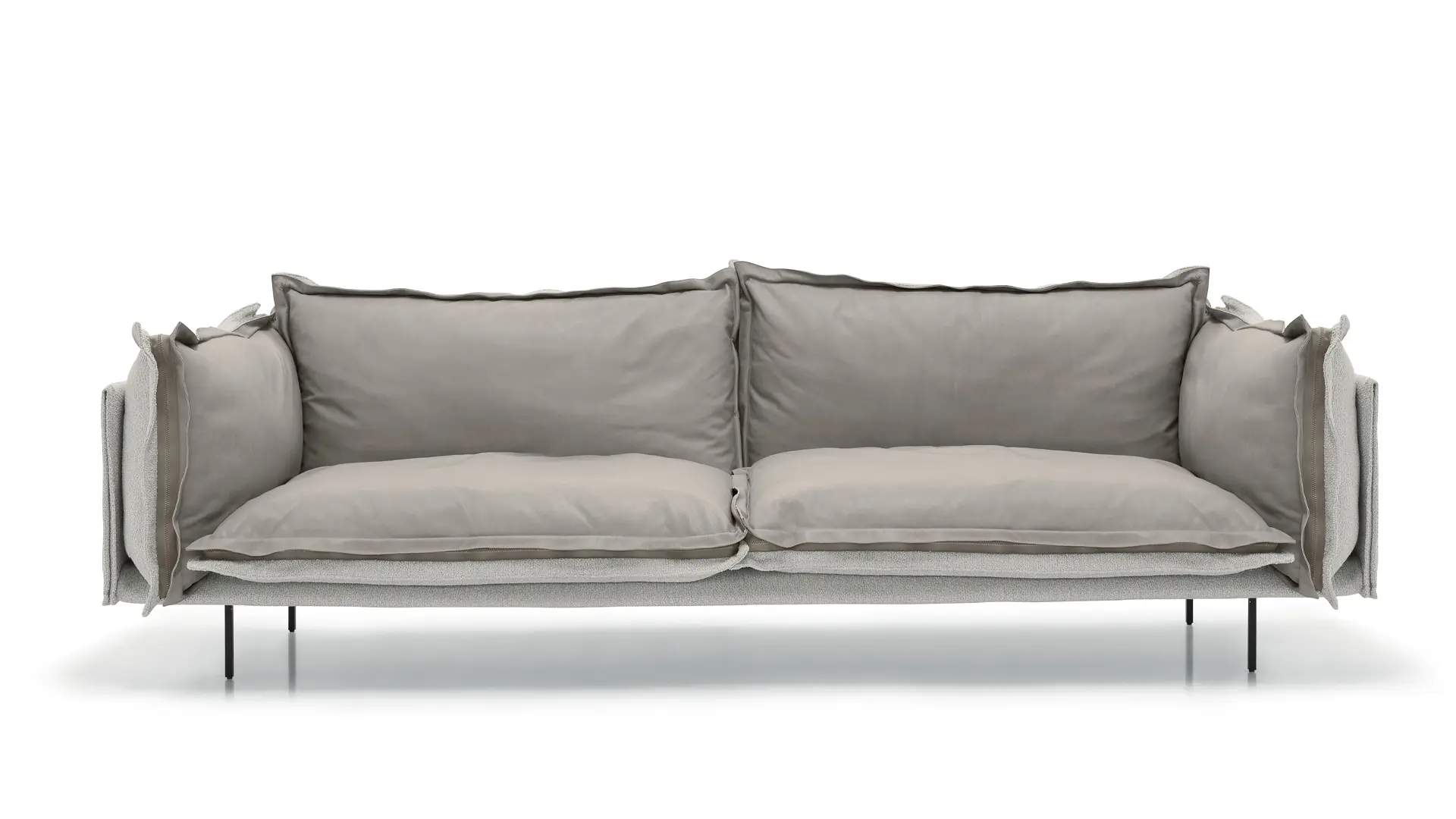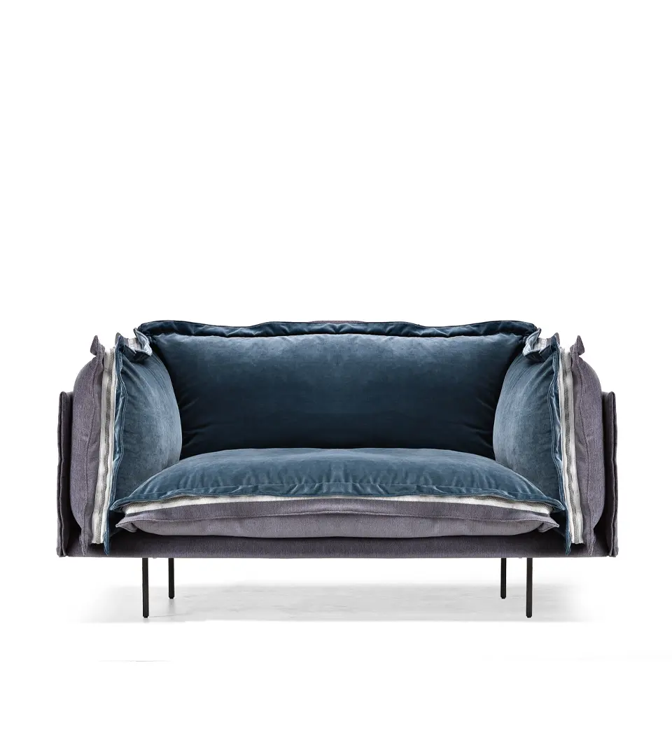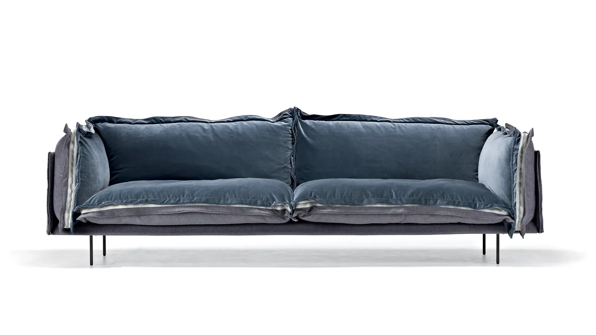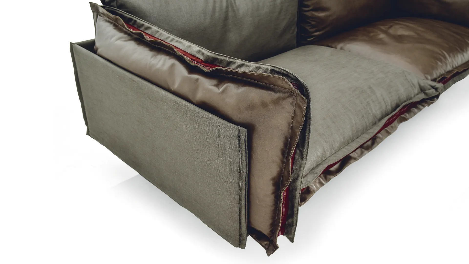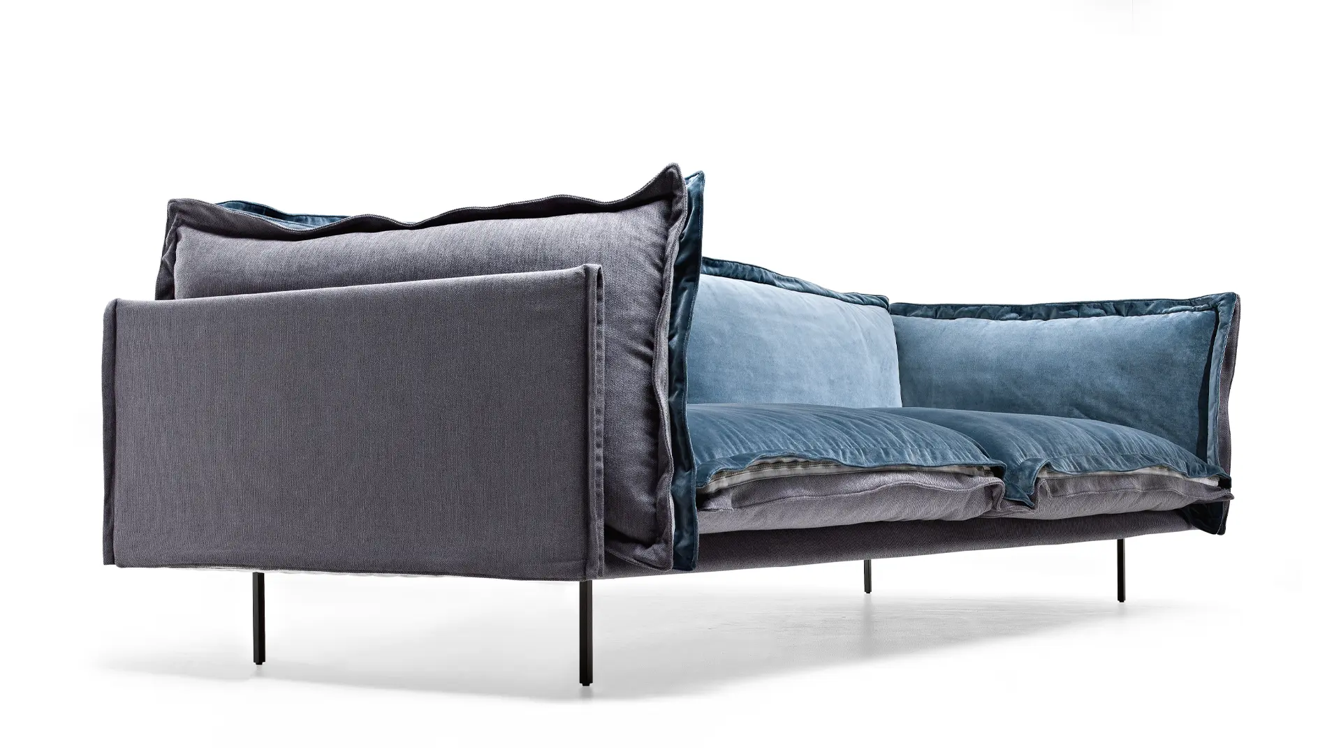 Son apparent désordre visuel s’oppose à l’ordre et au soin des détailles, pour obtenir an objet au style décidé, défini et haute de gamme. La structure subtile, élégante et discrète entoure et contient les coussins d’assise, de dossier et des accoudoirs, soulignés par des volants tout le long du périmètre qui donnent mouvement à là ligne du canapé et une extrême souplesse visuelle et tactile. La fermeture éclair importante, appliquée aux quatre cotés des coussins, unit les deux revêtements des coussins, donne rigueur et souligne le design particulier. Il est possible créer plus d’un million de combinaisons en mélangeant les couleurs des fermetures éclairs, des tissus et cuirs disponibles dans la riche collection Arketipo, pour obtenir des combinaisons chromatiques différentes et des assortiments sophistiqués. A l’intérieur du même produit et dans le même espace peuvent coexister la délicatesse, la chaleur du tissu et l’élégance du cuir. La structure se relève grâce aux jambes minimales réalisées en métal à section carrée.