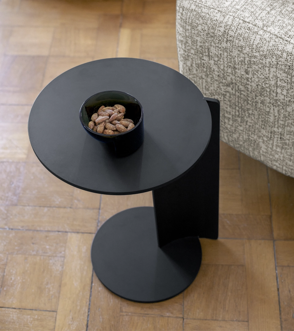 With a lighthearted name that evokes, from one perspective, a video game console and, from another, an aircraft pilot’s control column, the Joystick tables are works of both playful, even mischievous spirit and absolute precision. The impressive density of the metal plate is the compelling theme of Joystick, which delivers a powerful impression with its direct, emphatic design: two discs inalterably joined by a curved vertical plane. The eye-catching shapes are a realization of pure material in an archetypal minimalist conception. The sculptural object, concrete and rich in its profiling, finds in its polished, graceful thickness a cultivated style that resonates with the candor of its pure gray metal surfaces.