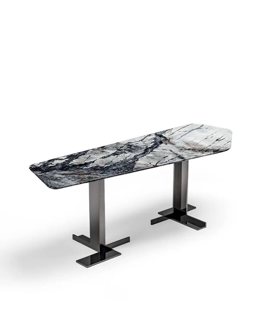Les plans d’appui sont caractérisés par des formes géométriques aux angles arrondis, tandis que les bases en métal forment des figures structurelles à l’allure fortement sculpturale, dans un dialogue conceptuel à la personnalité cosmopolite.