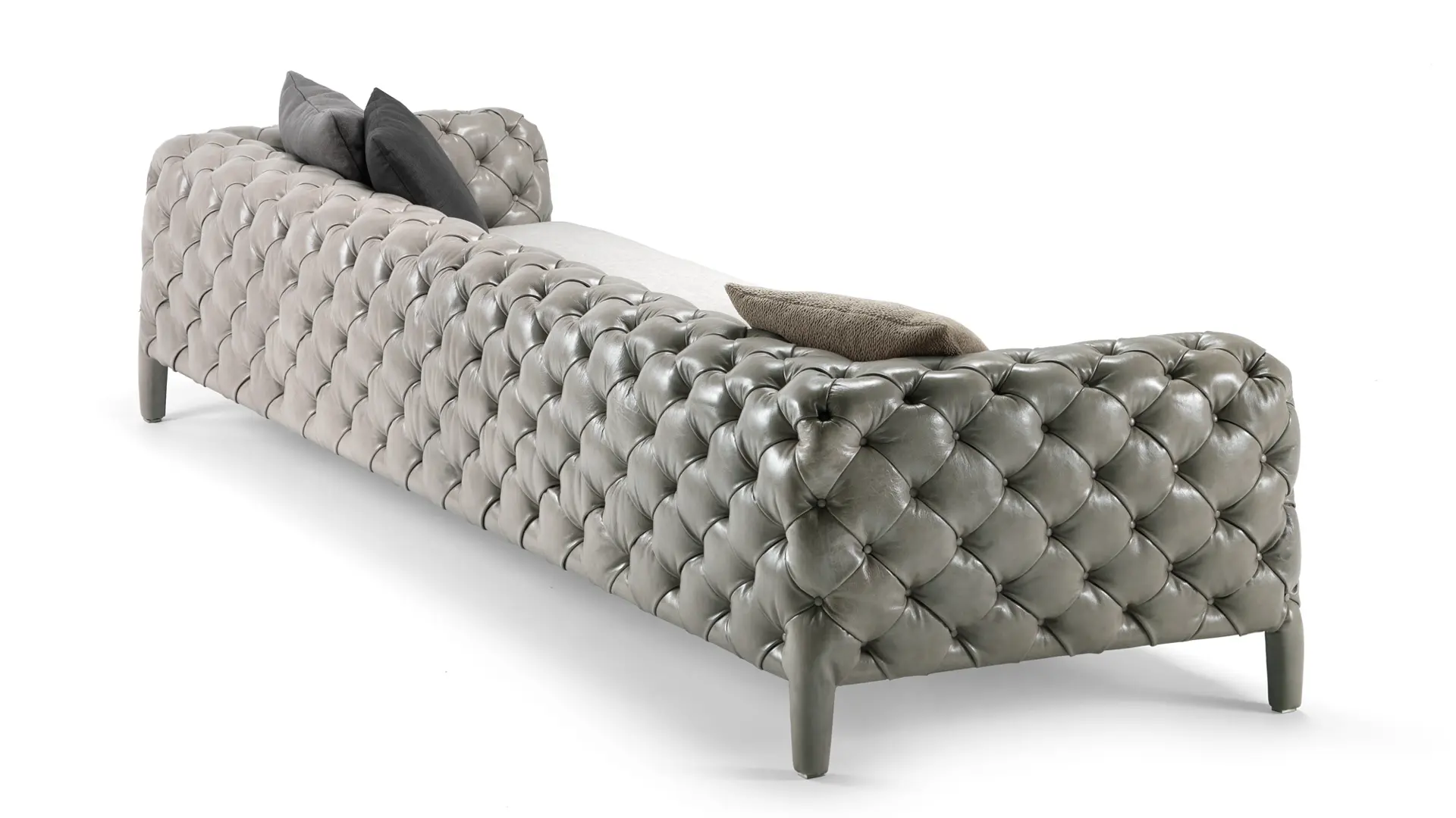 Réalisé exclusivement de façon artisanale, avec rembourrage capitonné, c’est un canapé décidément actuel, raffiné et recherché, mais avec un gout souple et accueillant, grâce au bouton typique qui s’enfonce dans le matelassé avec un dessin de rhombes. Windsor a augmenté sa gamme en ajoutant un canapé extra-large de 314 cm et avec la possibilité de la housse en velours, qui lui donne un aspect changeant et très riche.