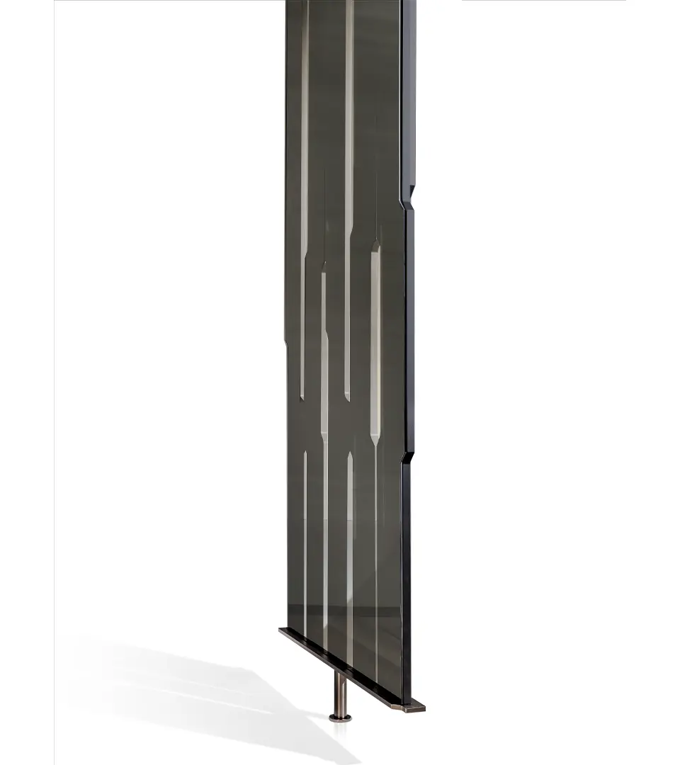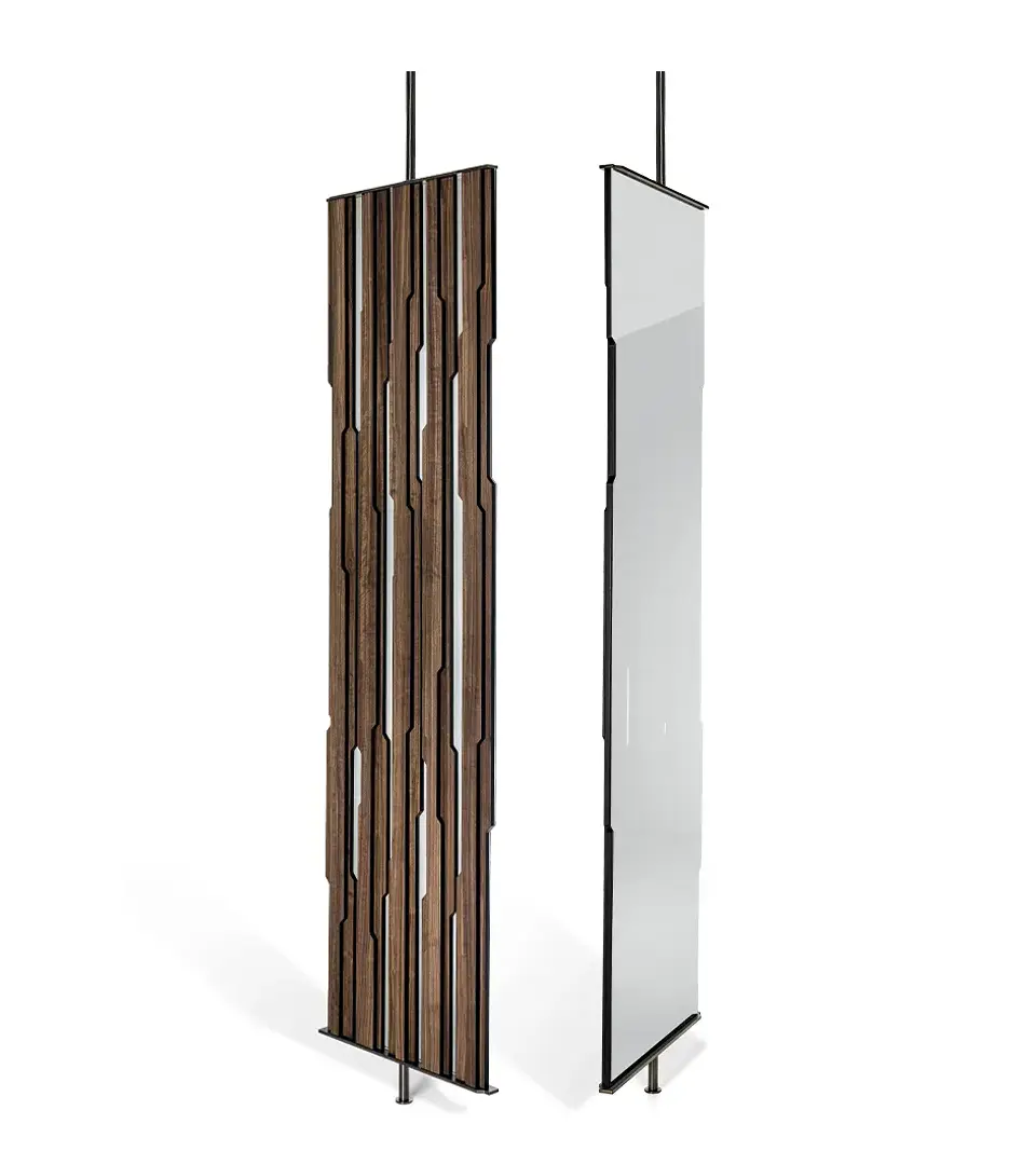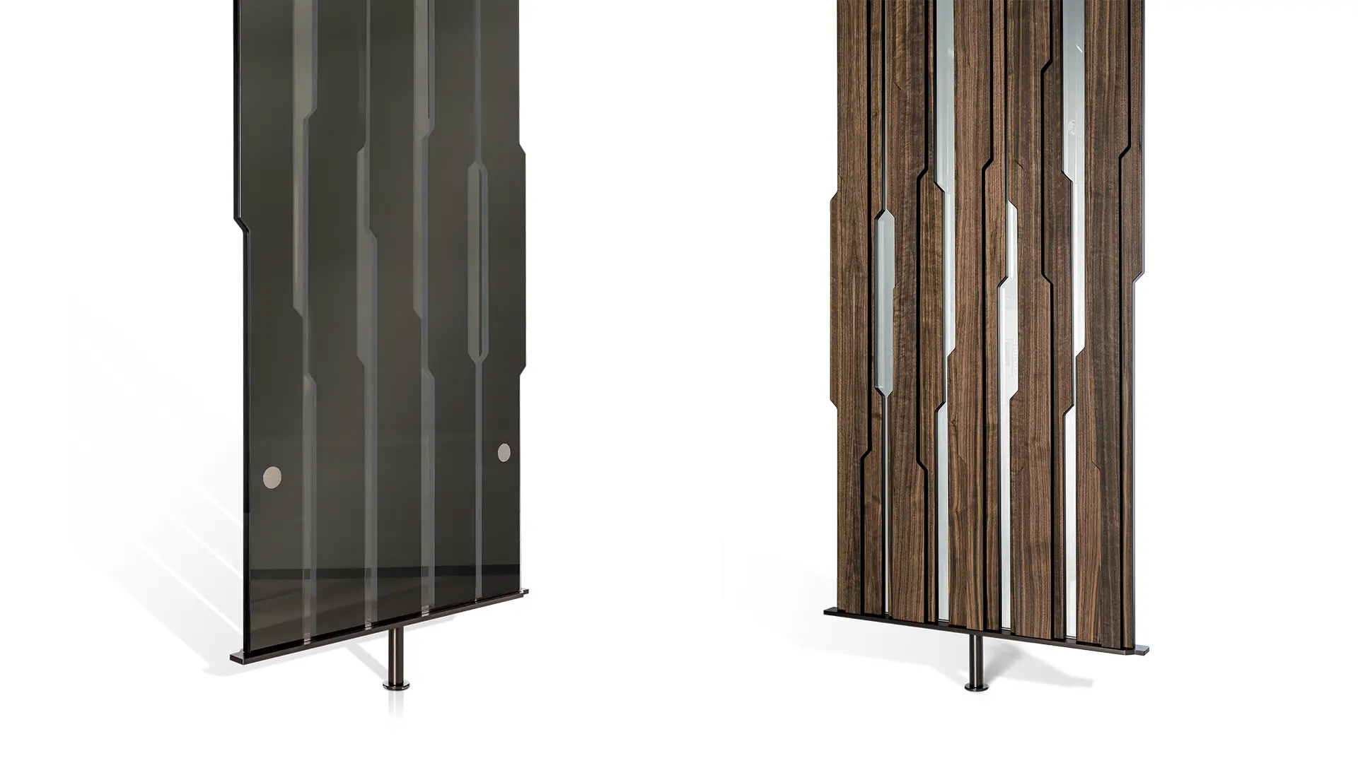 Questo nuovo ed esclusivo design guarda alla sovrapposizione, ai materiali in sequenza, creando un effetto tridimensionale altamente espressivo. Le suddivisioni creano divisioni nello spazio e permettono nuove prospettive e illusioni grazie all’elemento specchiato. Il risultato? Una combinazione di funzionalità e di forma che rivela nuovi modi di guardare la stanza a seconda di dove il separé viene posizionato.