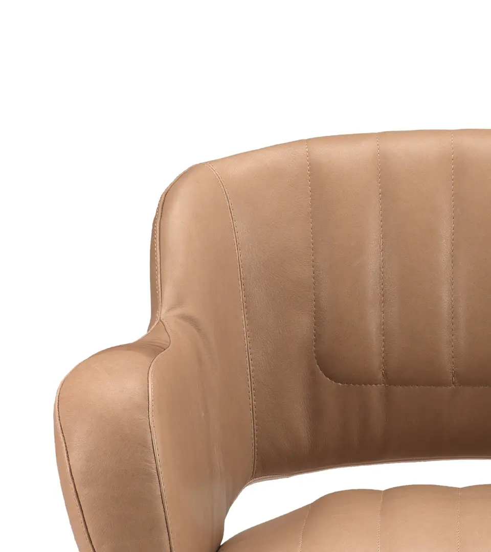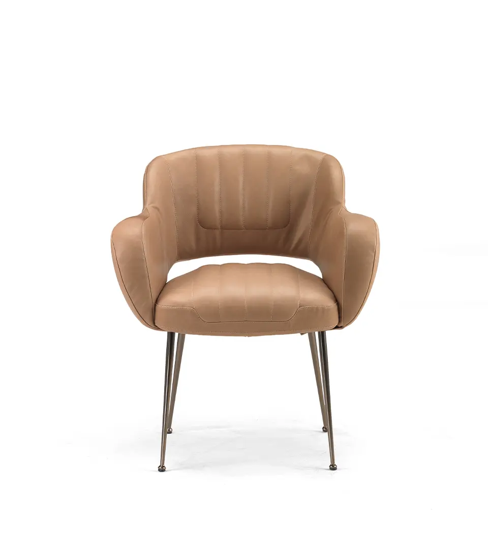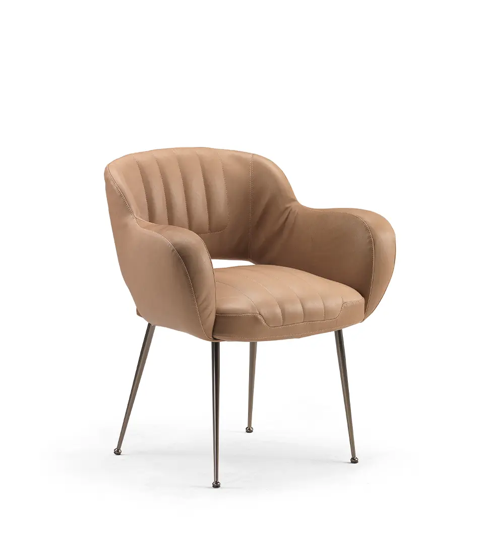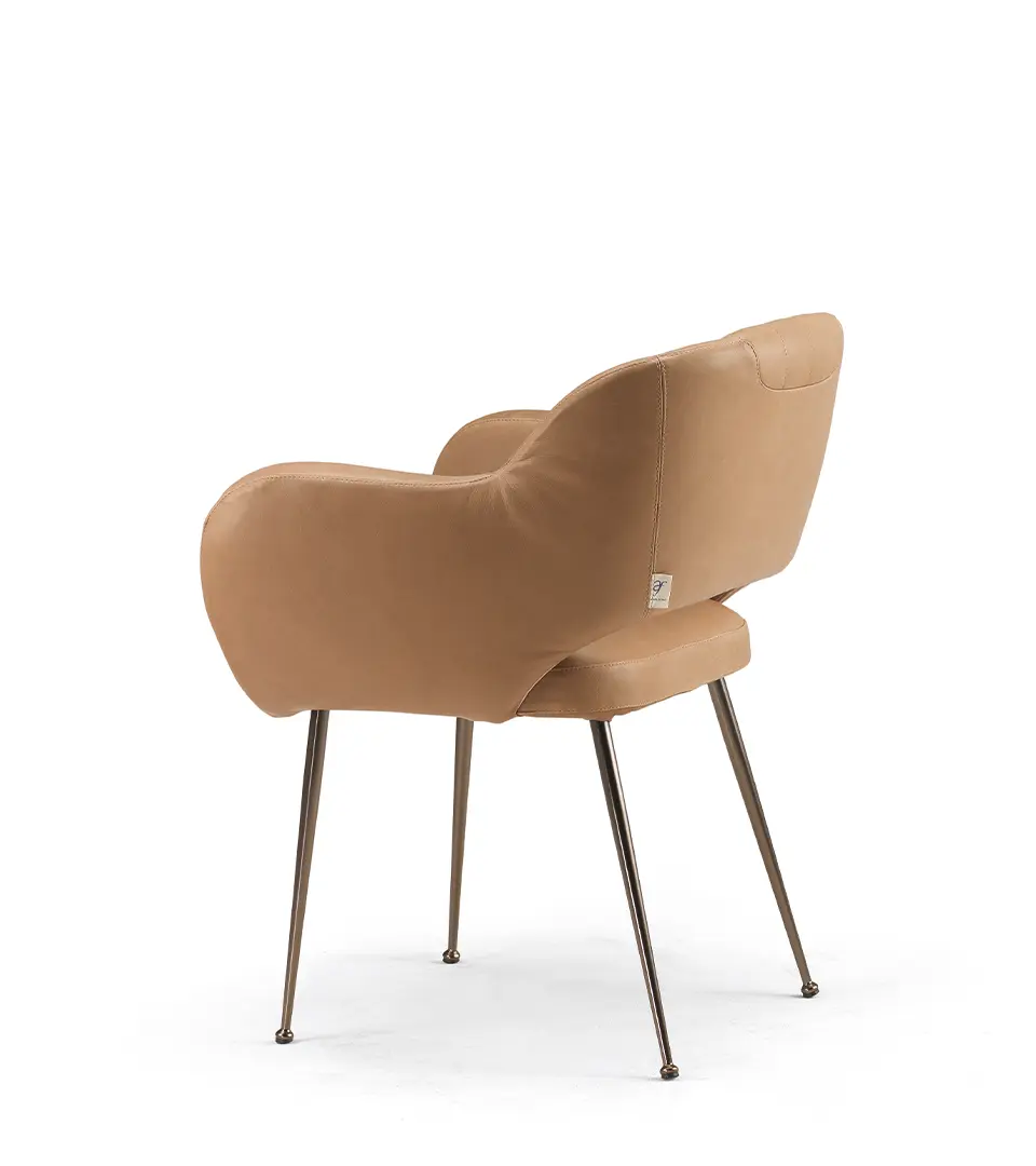 Sarebbe giusto dire che la si sarebbe potuta vedere negli anni ’60 o ’70, da qualche parte su Madison Avenue, in un ufficio pubblicitario o in una casa neo classica. La spessa seduta arrotondata e imbottita trasmette una sensazione di estremo comfort, mentre le esili gambe in metallo mostrano la raffinatezza.