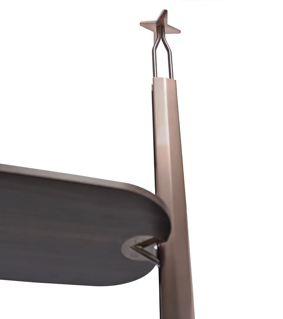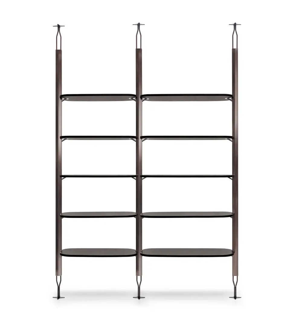 Grazie alla sua configurazione versatile, che permette l’ancoraggio dal pavimento al soffitto o da terra alla parete, il sistema si presta perfettamente a vivere come protagonista a centro stanza, trasformandosi in un divisorio etereo che organizza il living con un lusso discreto e un rigore senza tempo.