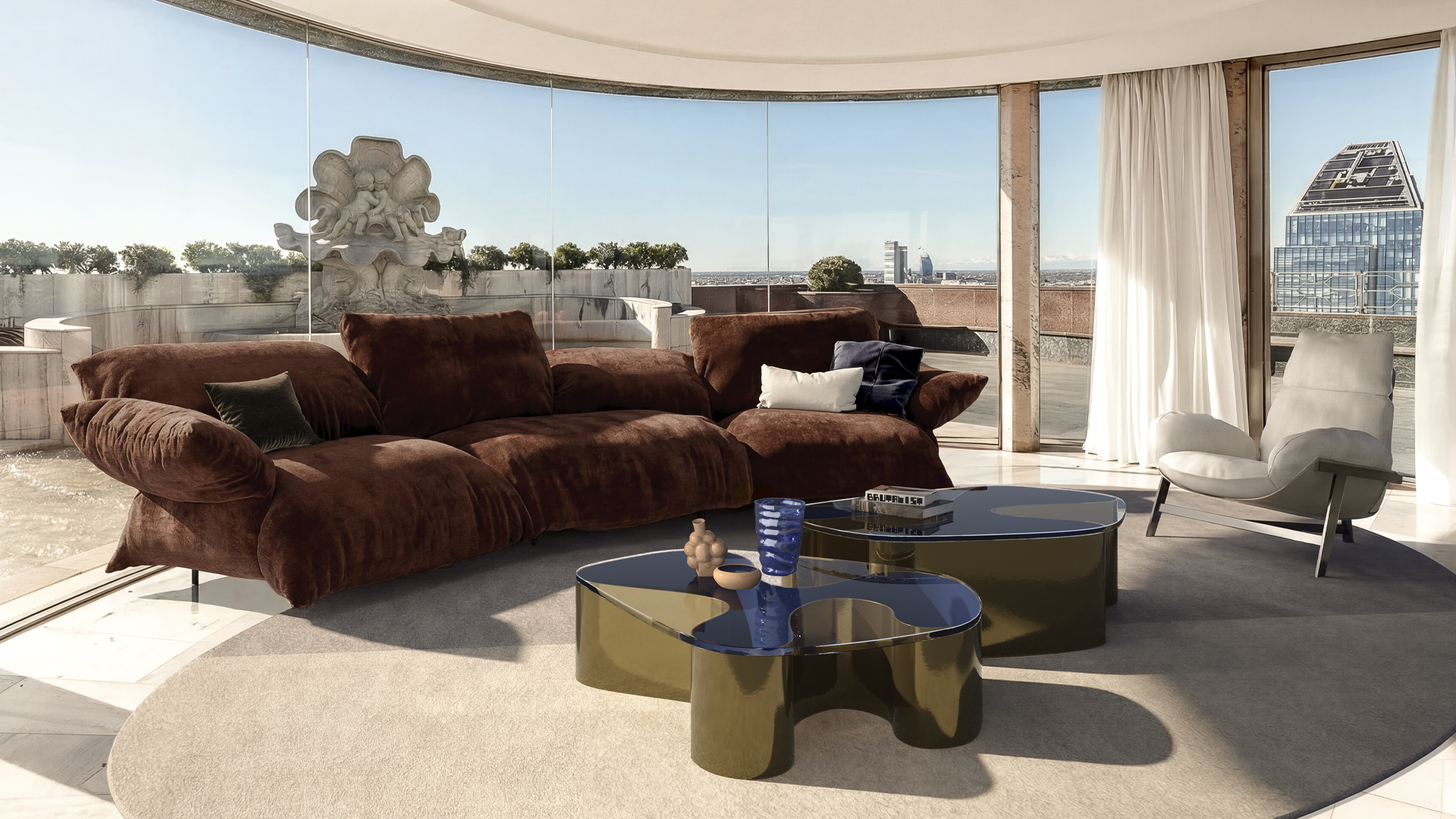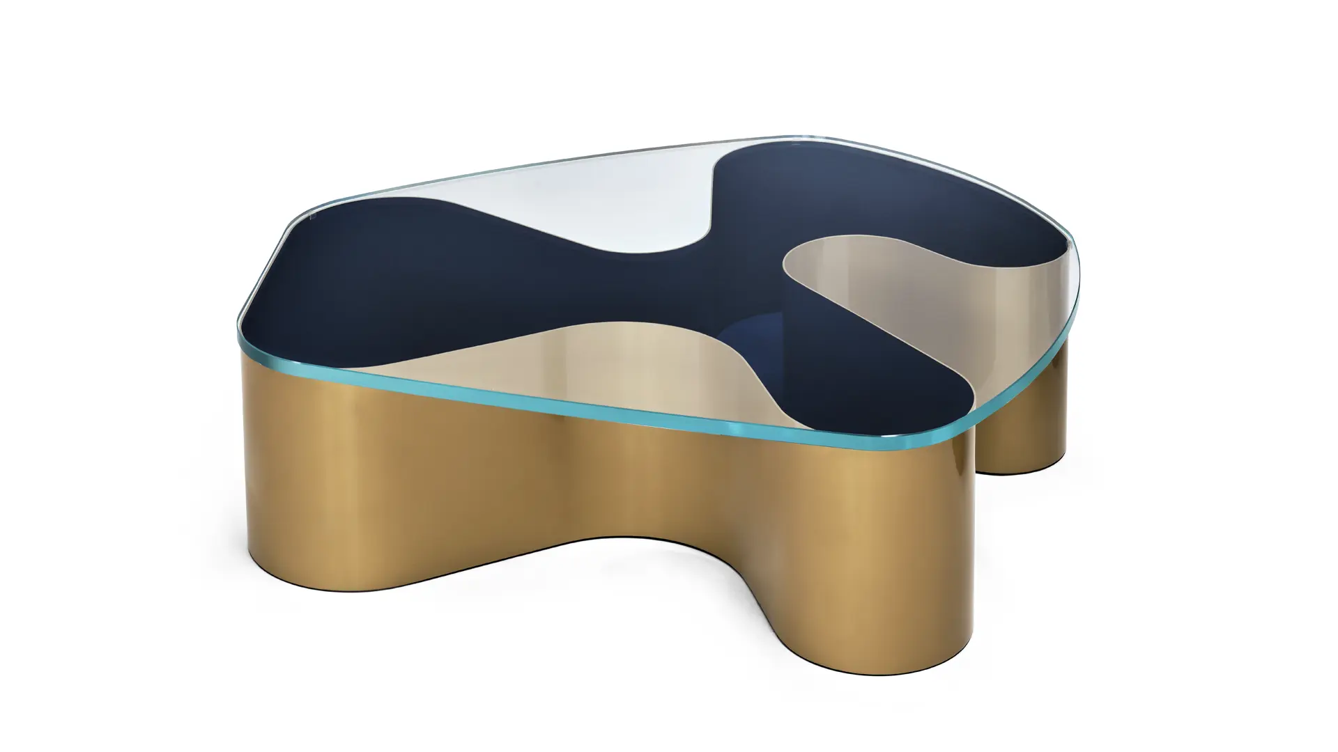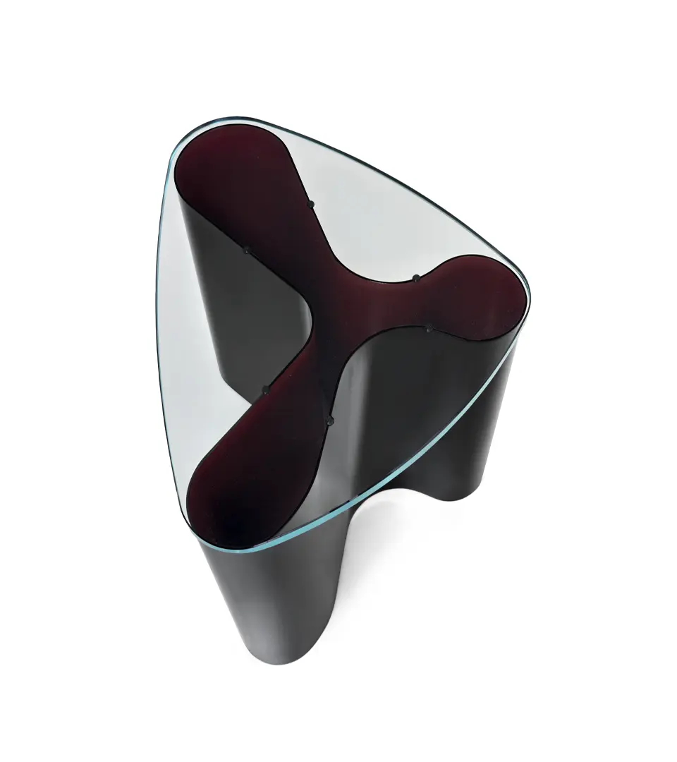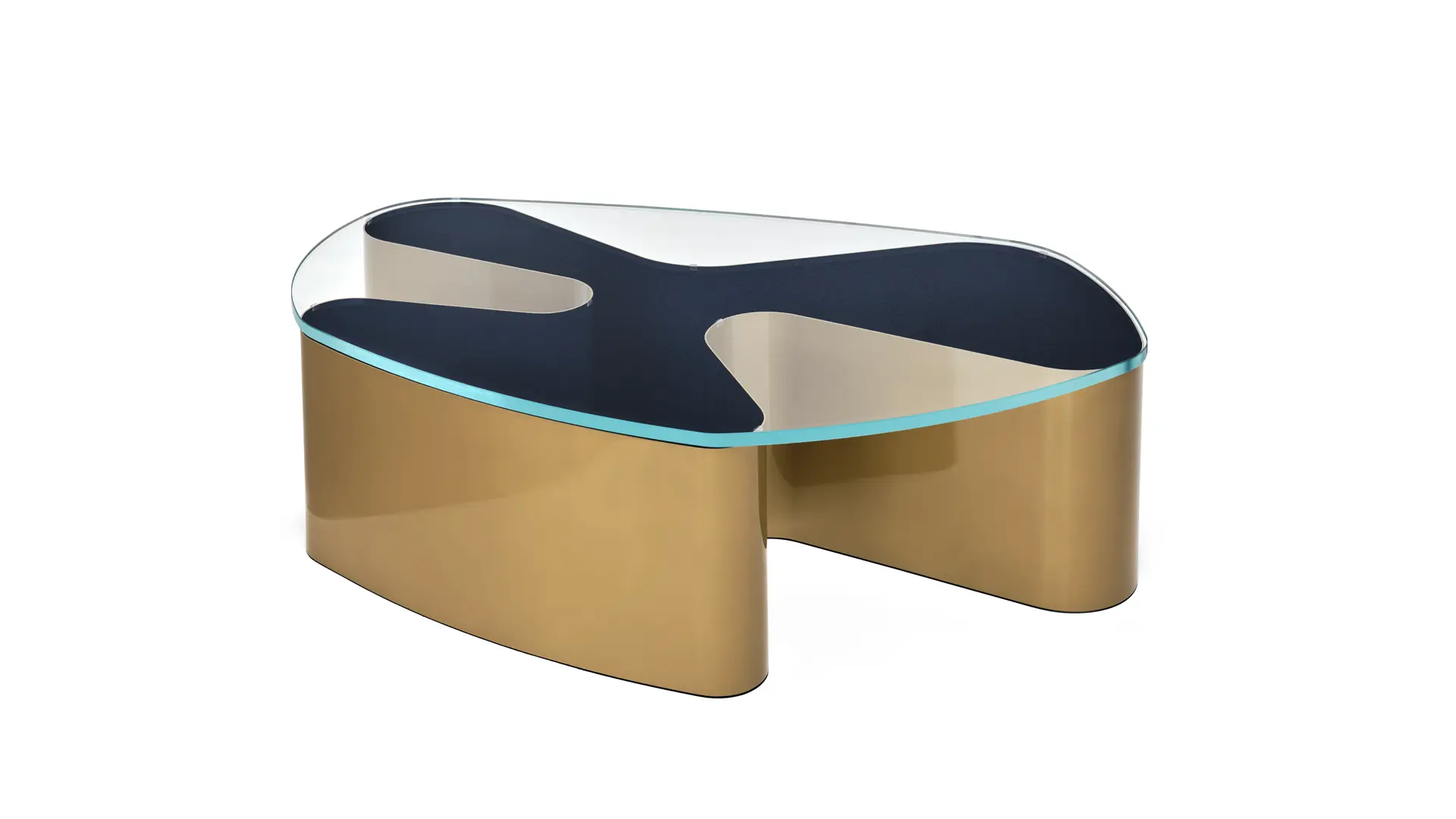 Tuttavia, il vero segreto di questa collezione risiede nel suo interno, accessibile solo attraverso il gioco di sguardi con la superficie. Qui, dove la struttura si piega e crea rientranze, si nasconde una laccatura interna a contrasto, vibrante e definita, proposta in rosso intenso o blu profondo. Questa scelta di colore non è una semplice finitura, ma un’anima nascosta che si lascia intravedere attraverso la trasparenza di un top in vetro temperato di alta qualità. Il vetro non solo protegge, ma rifinisce l’intero design, donando un’inaspettata leggerezza visiva e creando un’illusione di profondità che esalta l’imponente struttura sottostante.