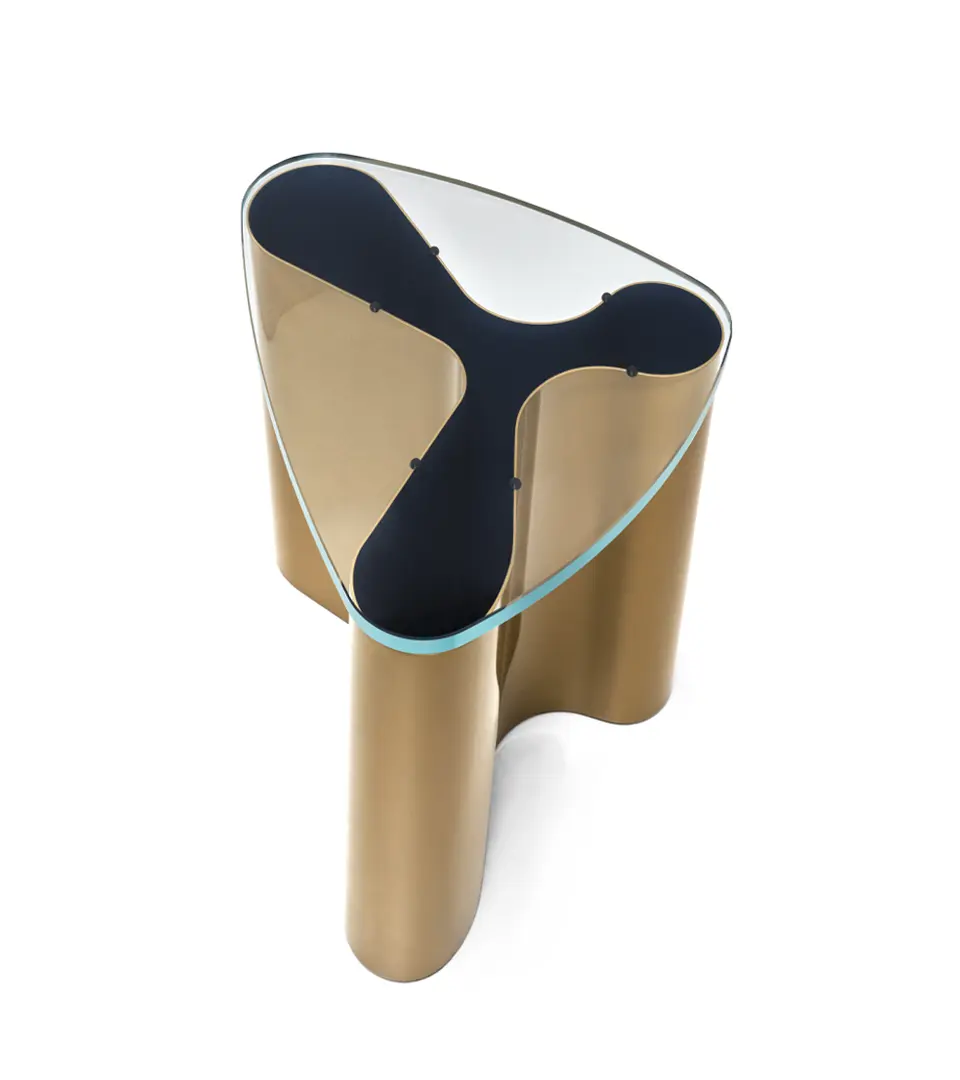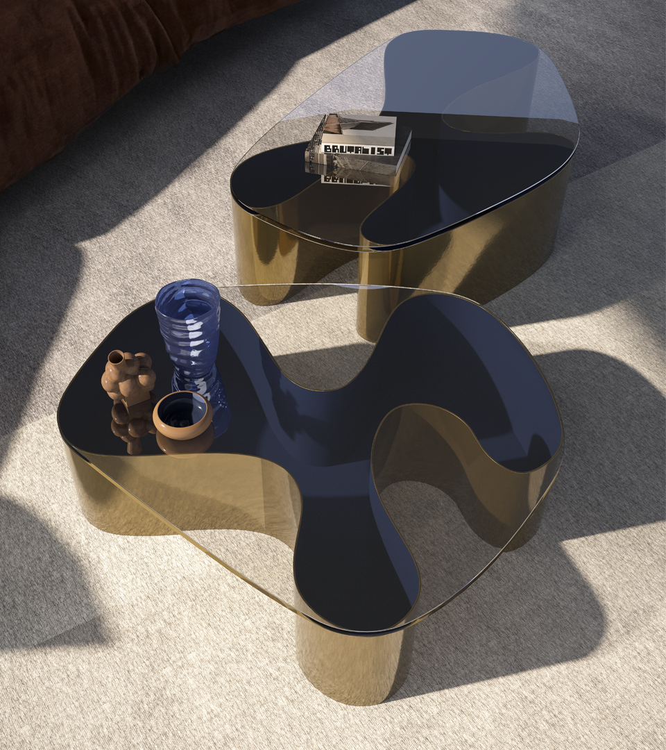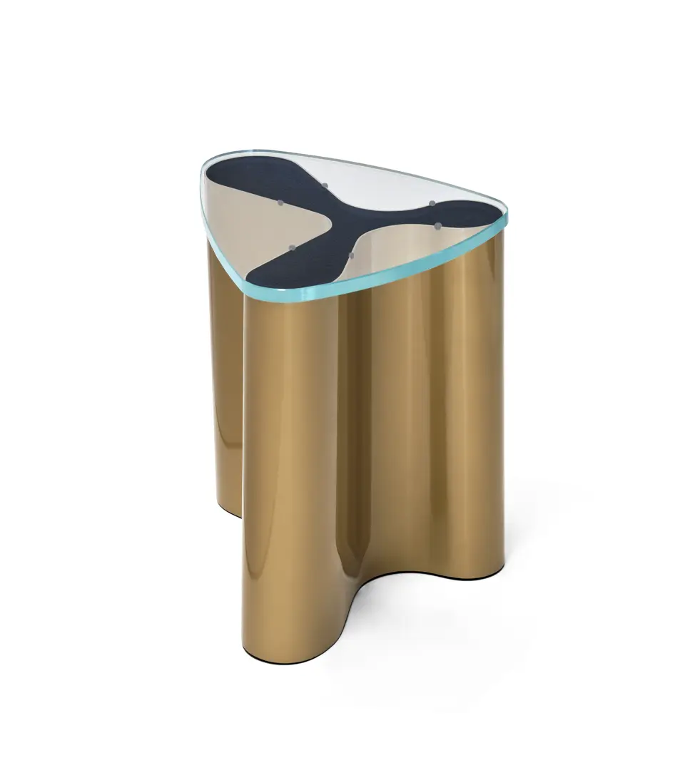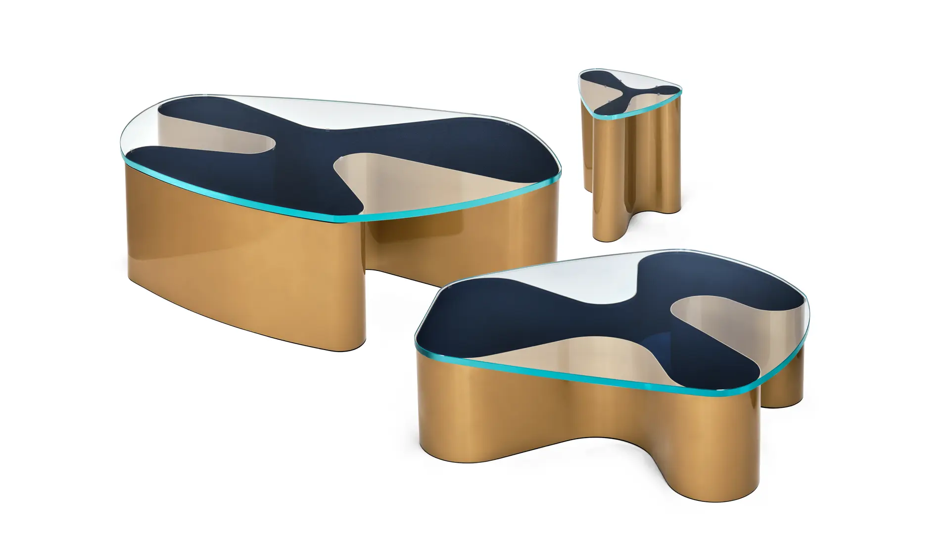Un’eleganza scultorea che si svela per contrasto, un dialogo tra la presenza monolitica della base e l’inaspettata esplosione di colore. Questi tavolini nascono da un nucleo di carattere, avvolto in un guscio esterno di pura finitura metallizzata. Che si scelga l’oro shiny, con i suoi riflessi caldi che evocano il lusso classico, o il black glossy, un’oscurità liquida e misteriosa, la percezione è quella di un volume prezioso, quasi architettonico.